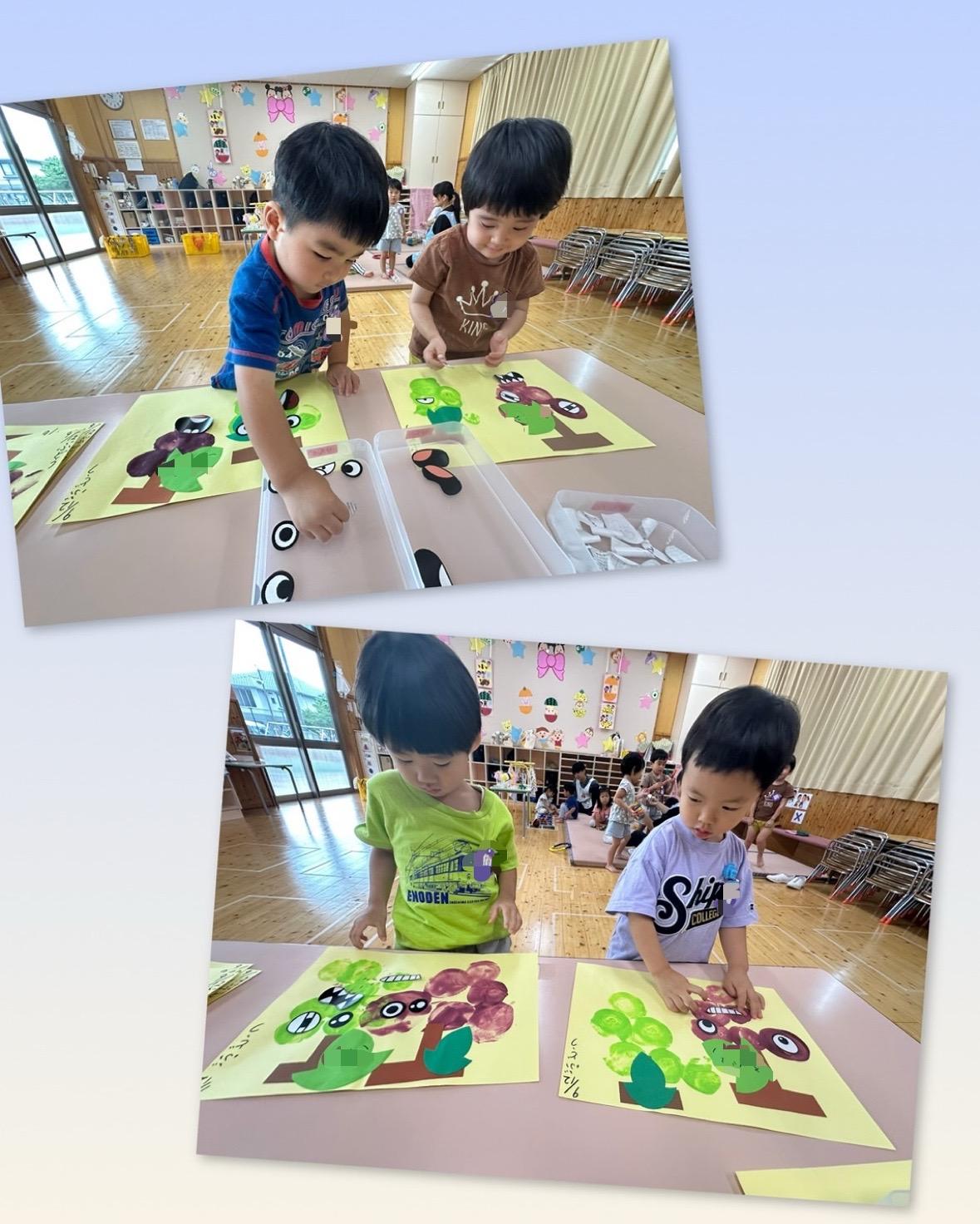 葉っぱをのり付けした後は、好きなパーツを選んでコミカルな作品に🎶