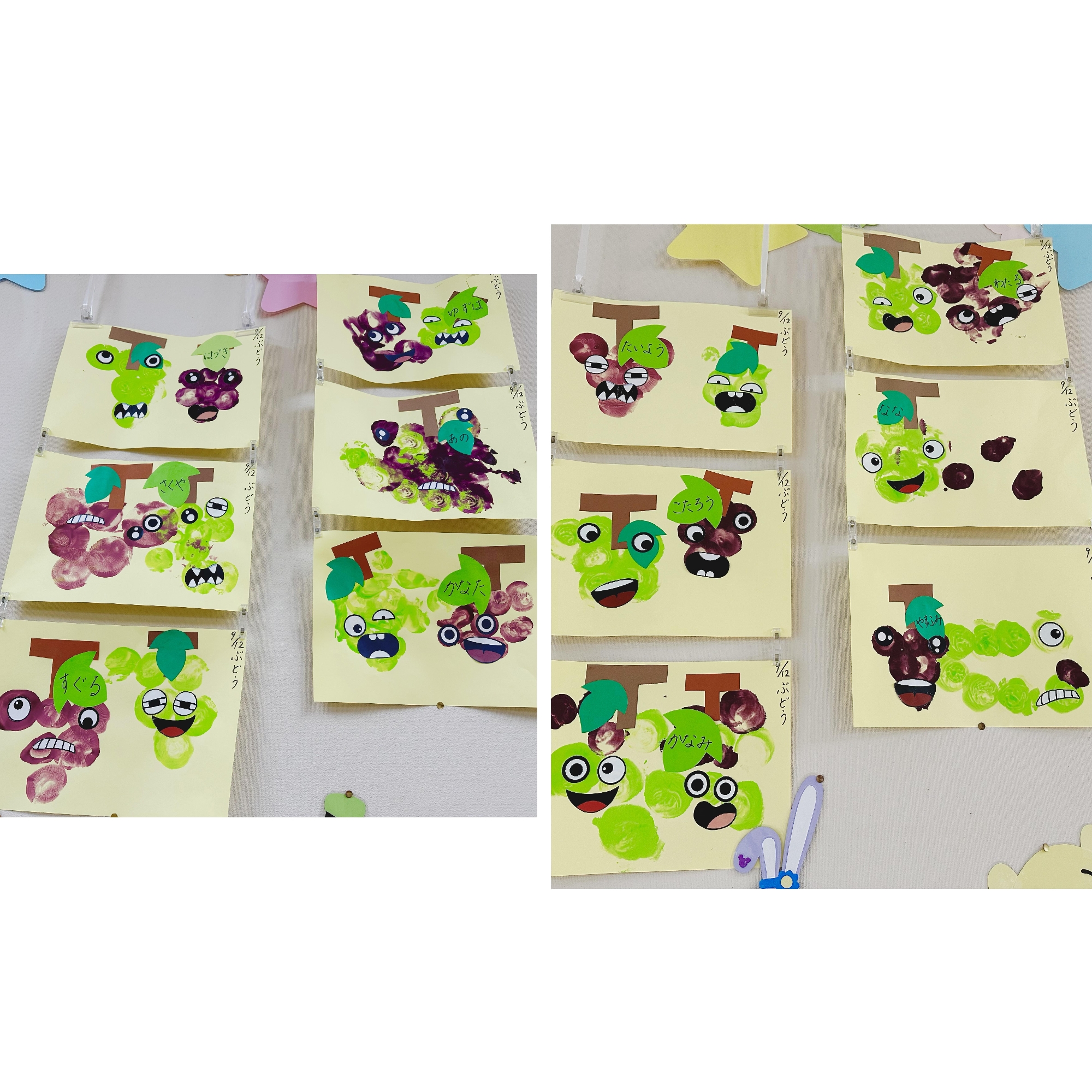 風船にたっぷり絵の具をつけて制作した、マスカット&巨峰は、押す強さで大小様々な房が完成しました🍇