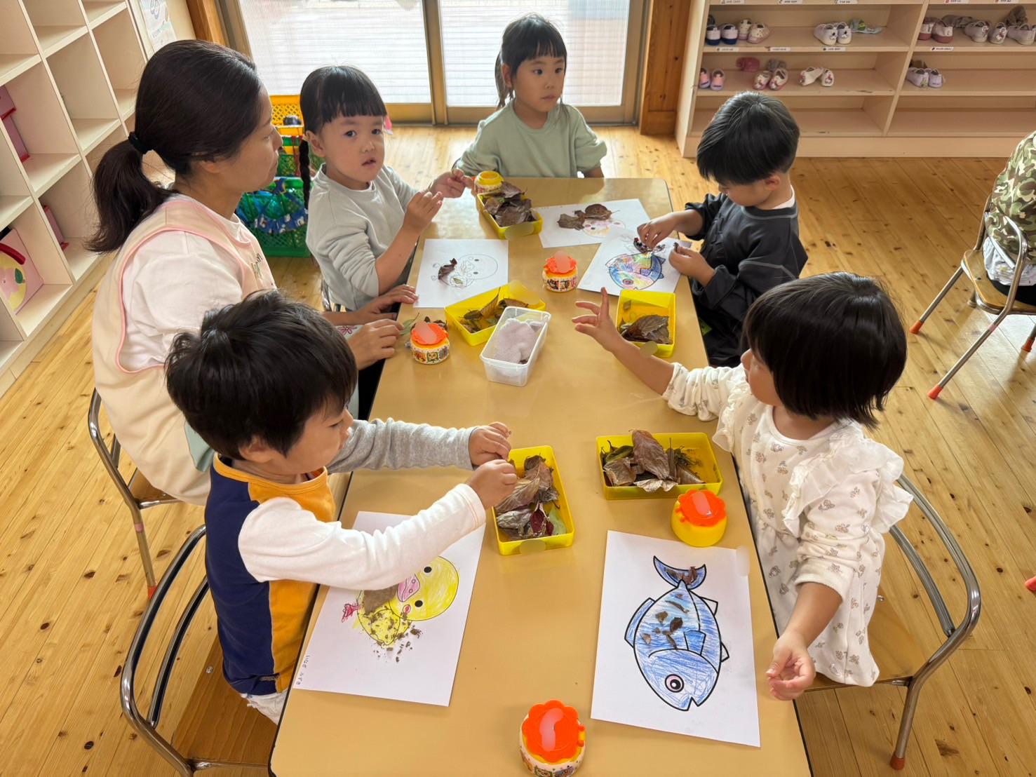 そして拾ってきた葉っぱや木の実を使って制作を楽しみました!