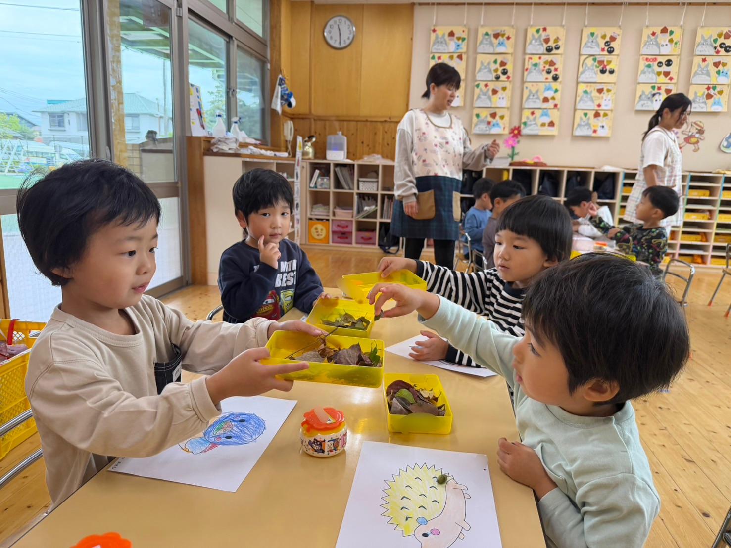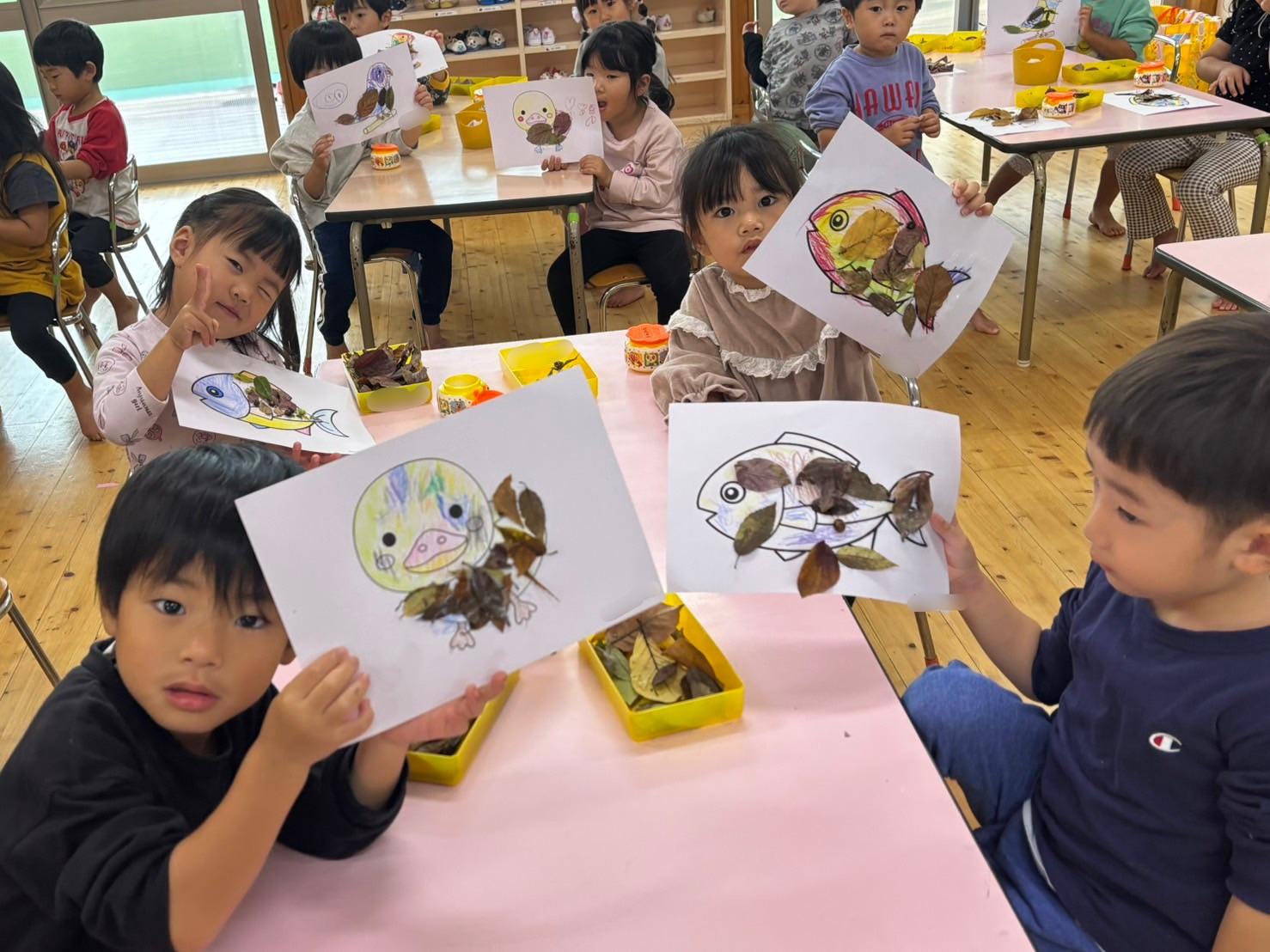 先週のお散歩で、秋にはいろいろな形や色の葉っぱが落ちていることを知った年少組のお友だち(^^♪
