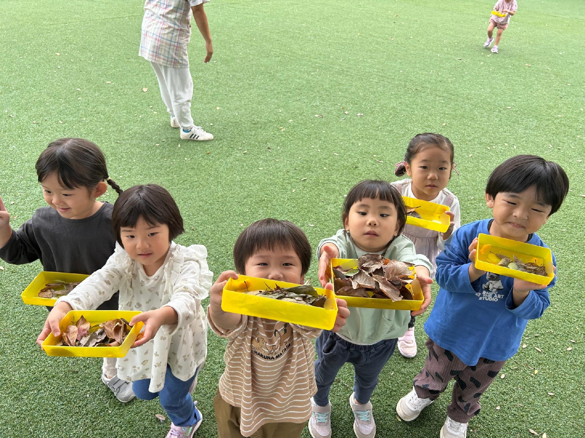 公園でもたくさんの葉っぱを拾って秋を感じていましたが、園庭でもたくさんの葉っぱを集めることができました🍁