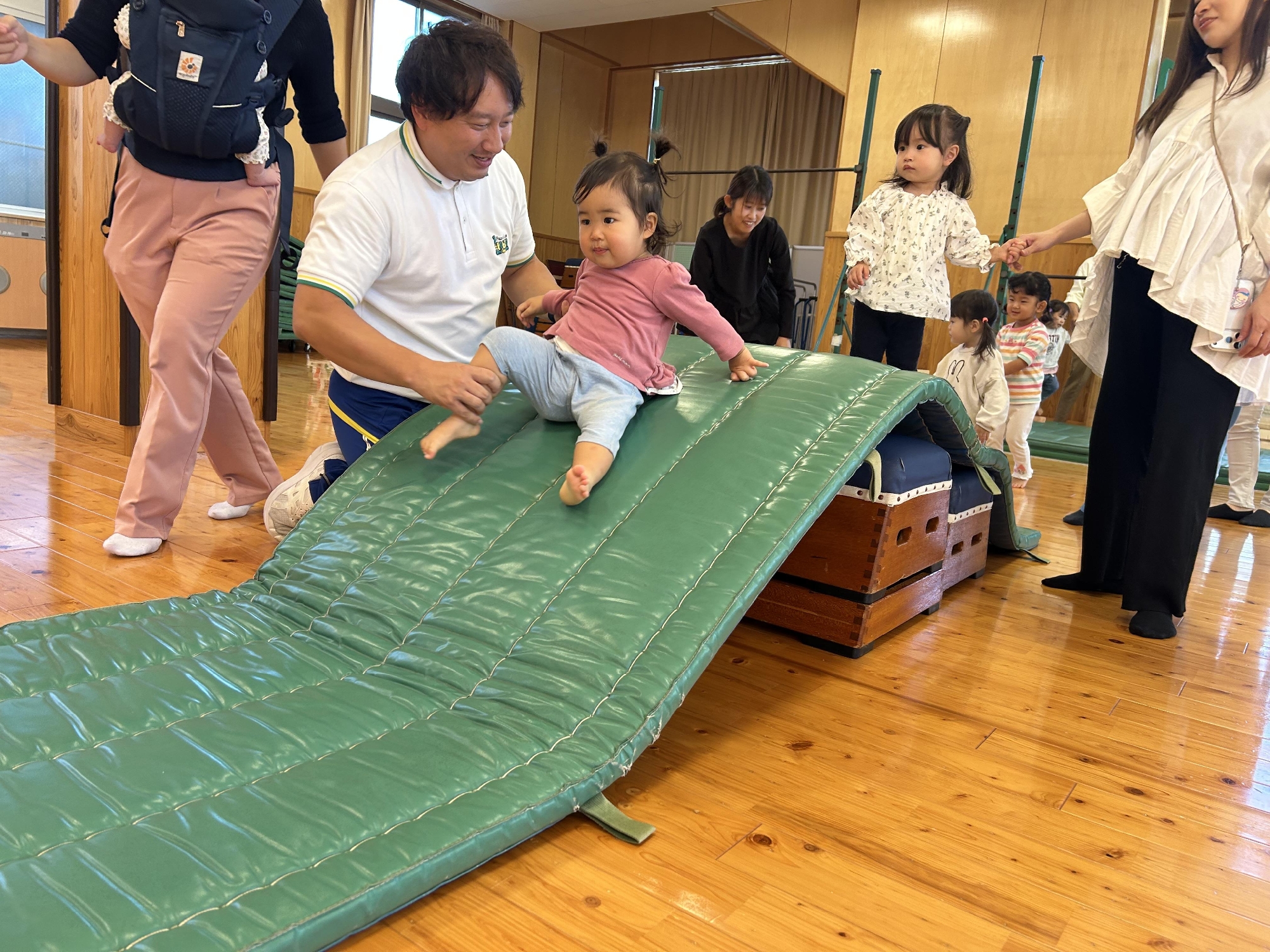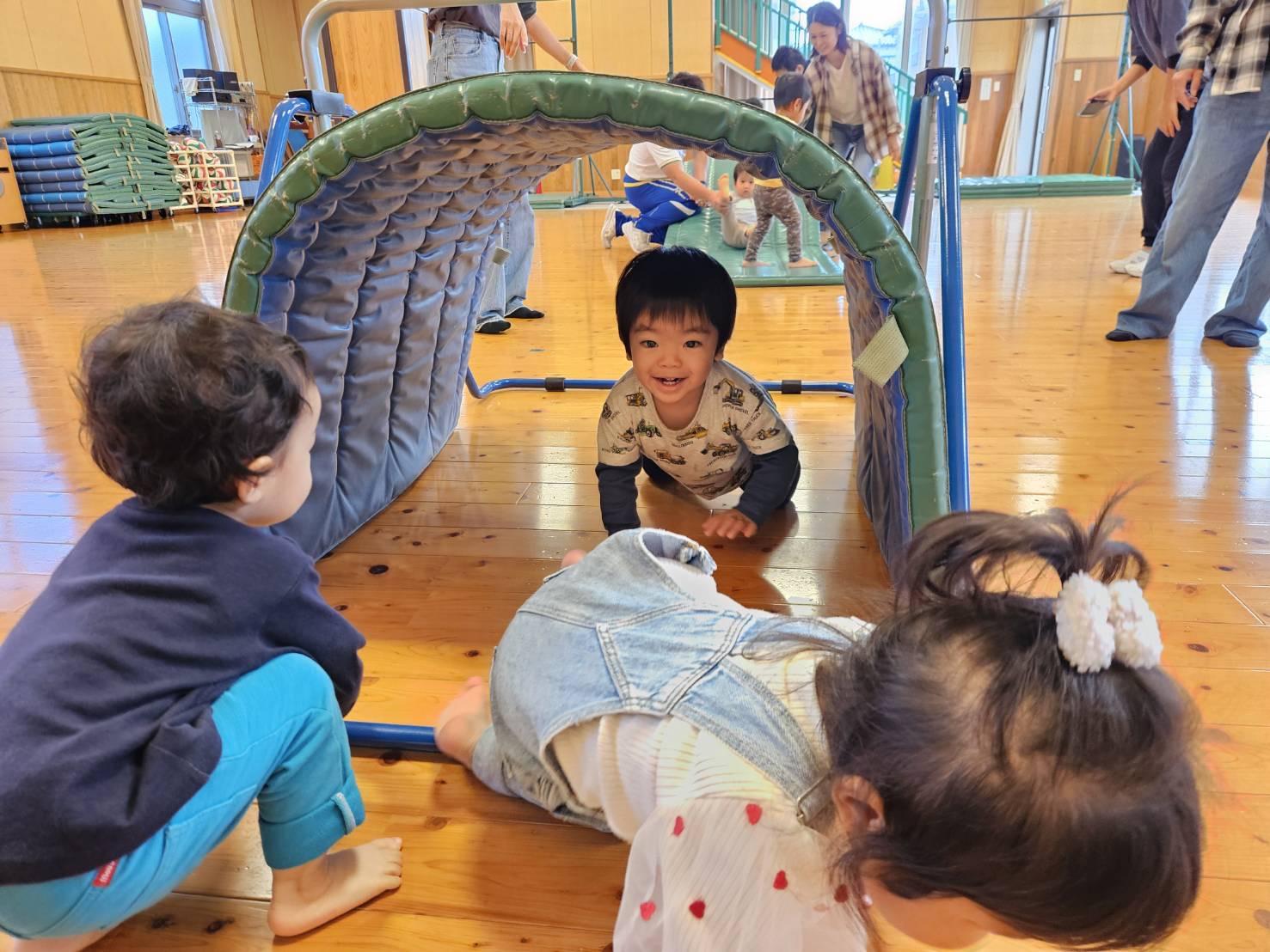 最初は初めての事ばかりで緊張している子もいましたが、親子体操やボール遊び、鉄棒、滑り台、トンネルなどしていくうちに少しずつにこにこ笑顔になりました☺️
