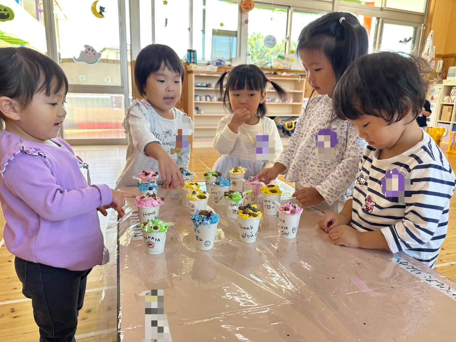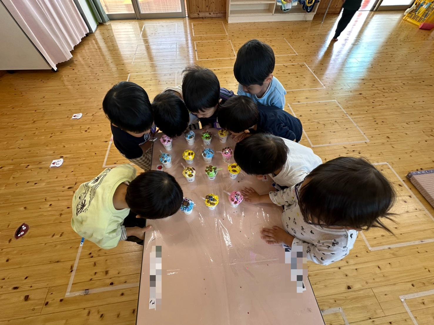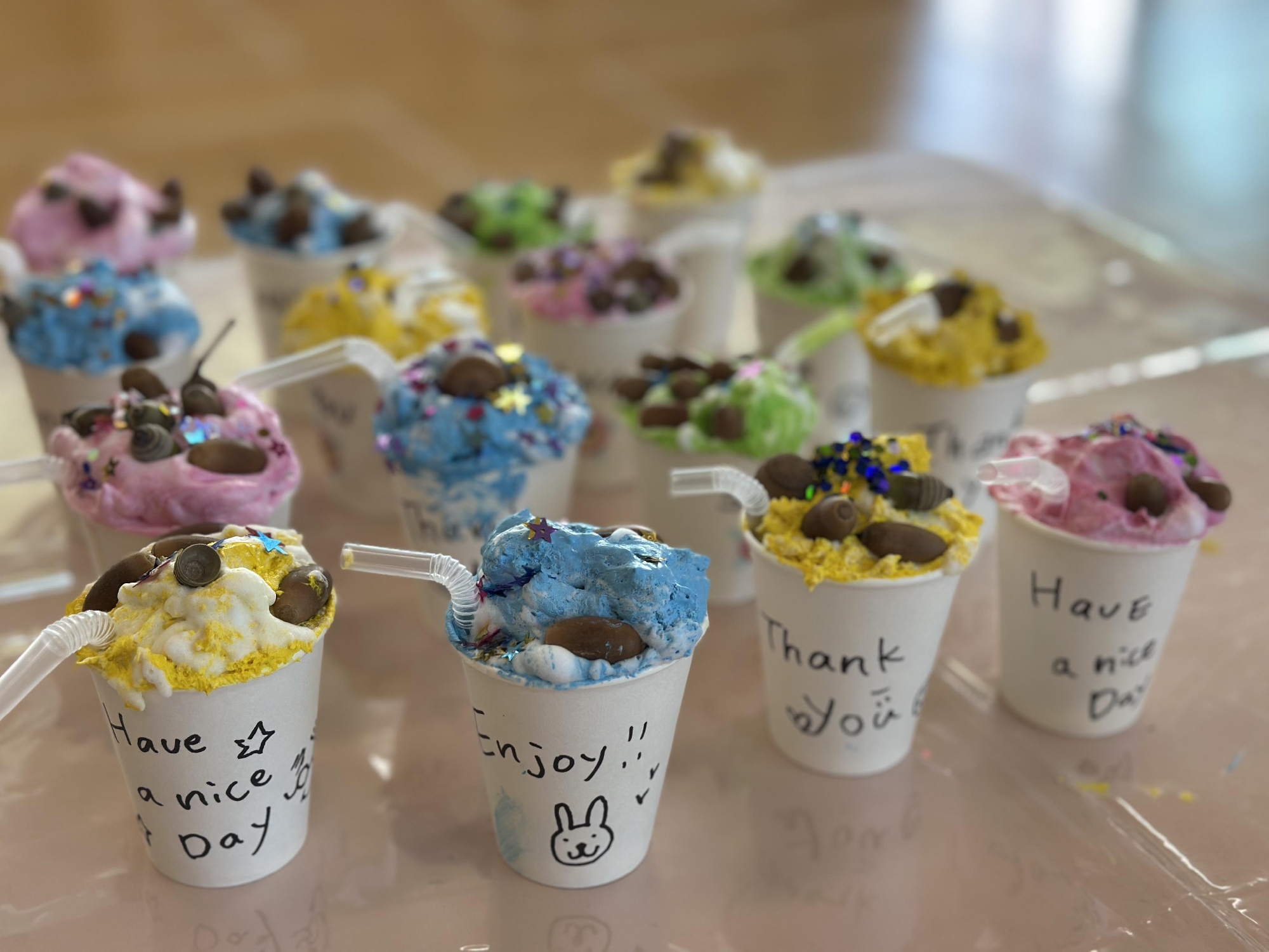 シェービングクリームと好きなお味の絵の具をまぜまぜ🎨マーブル調に変化したクリームをカップに注ぐ子どもたち👦🧒まるで、あの有名なお店のカフェ店員さんのようでした☕️