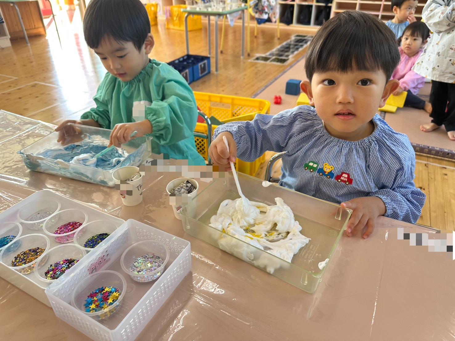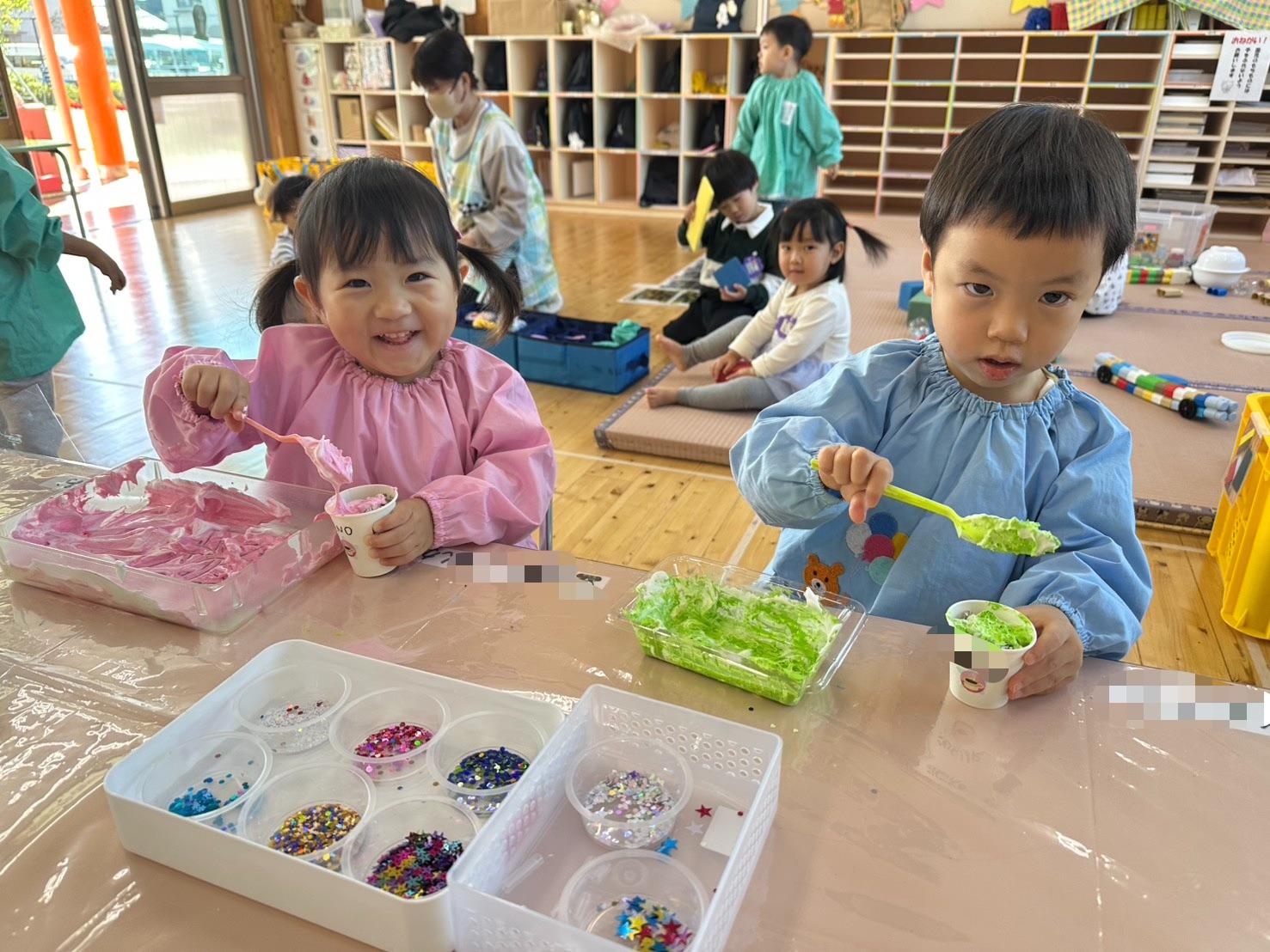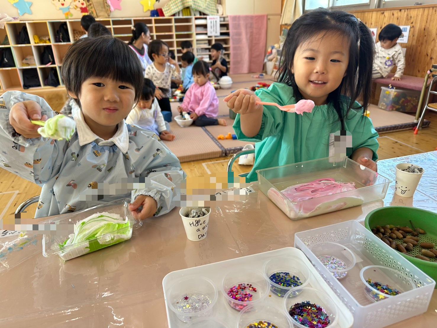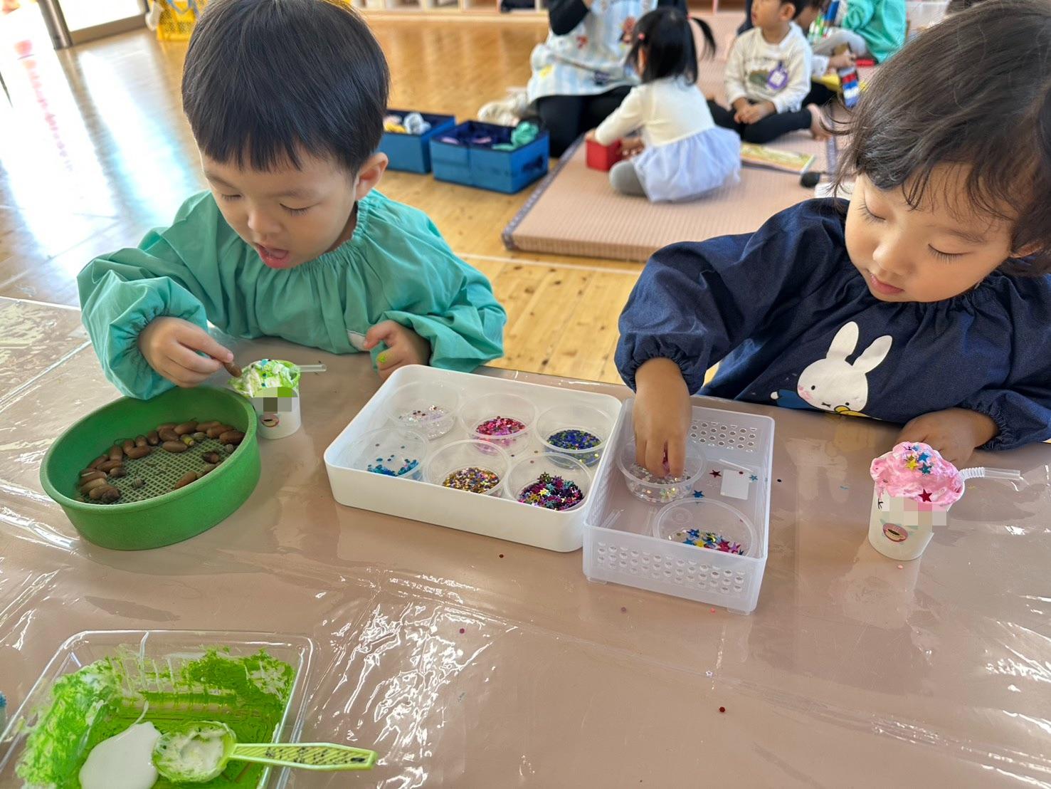 シェービングクリームと好きなお味の絵の具をまぜまぜ🎨マーブル調に変化したクリームをカップに注ぐ子どもたち👦🧒まるで、あの有名なお店のカフェ店員さんのようでした☕️
