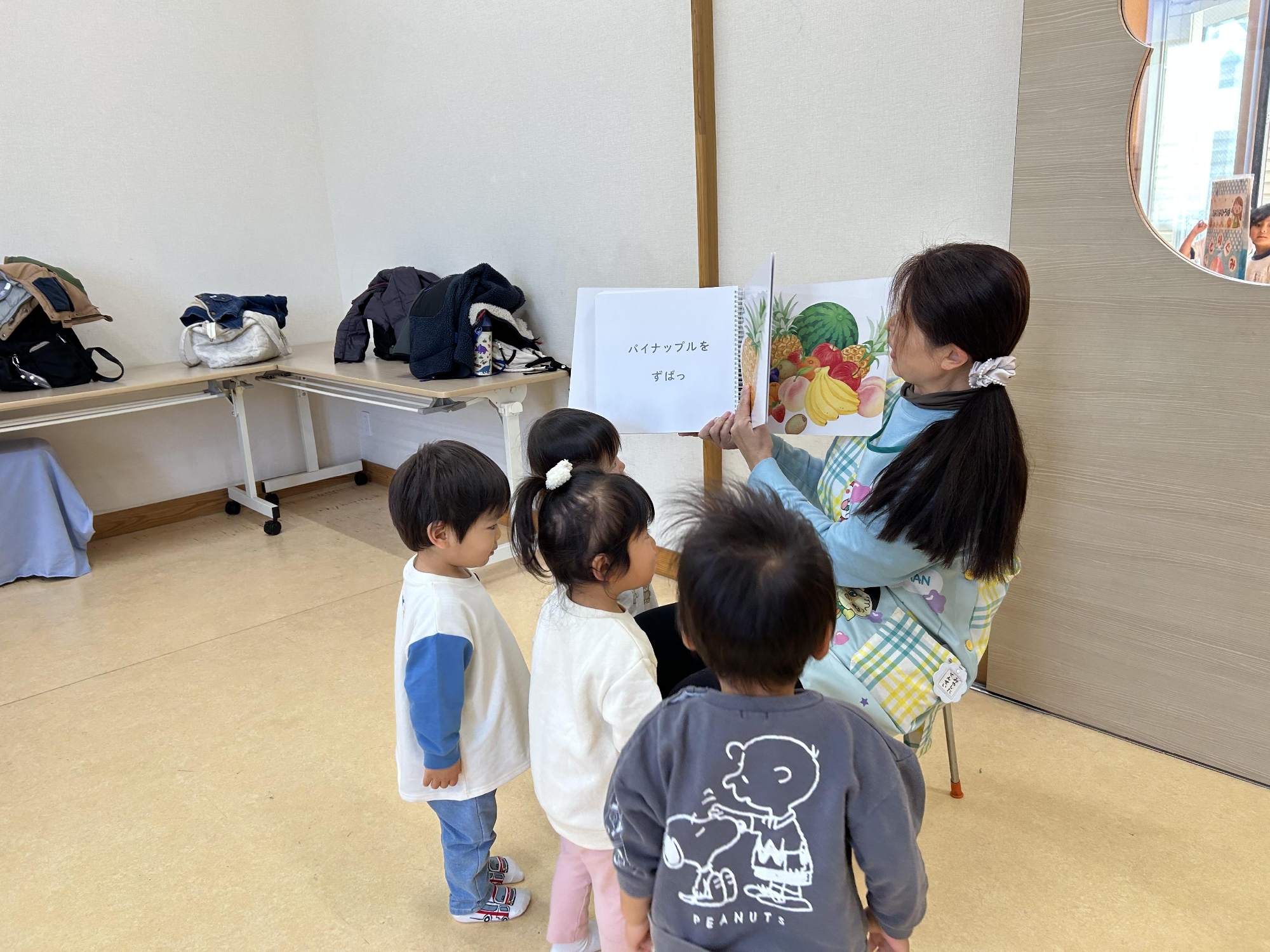 絵本の果物をつまんで、「はい、どうぞ!」とおくちの近くに持っていくと、おくちを「あ~ん」と開けてもぐもぐと食べる姿がとってもかわいかったです🥰🎶