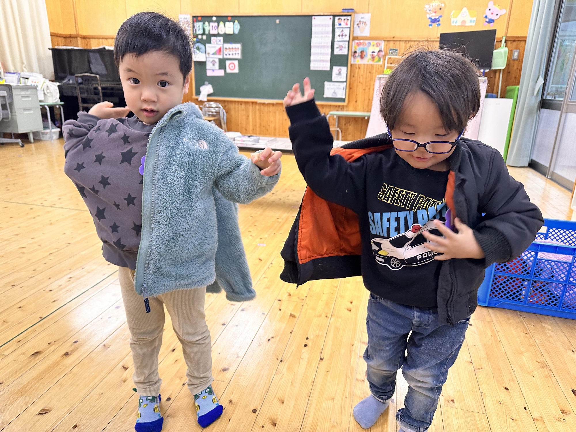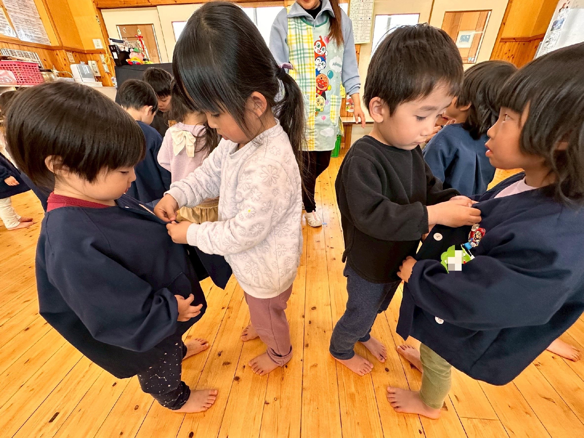 ふたば組さんには園服を羽織らせてもらったりボタンの掛け方を教わりました✨